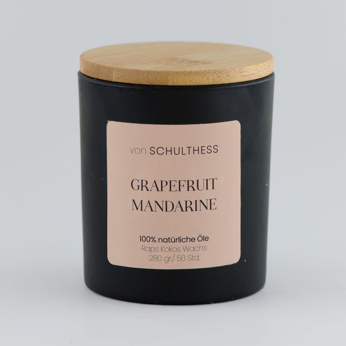 Duftkerzen im schlichten Schwarzglas mit Bambusdeckel mit 100% natürlichen Essenzen.